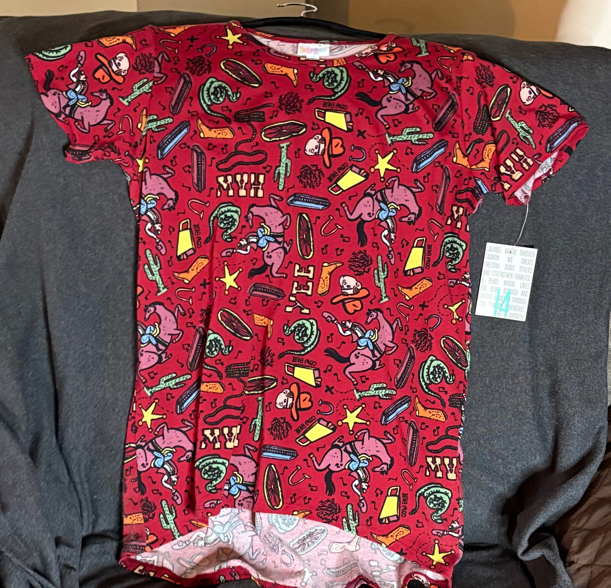 Short sleeve T slightly longer in the back. Only one available in size 14.